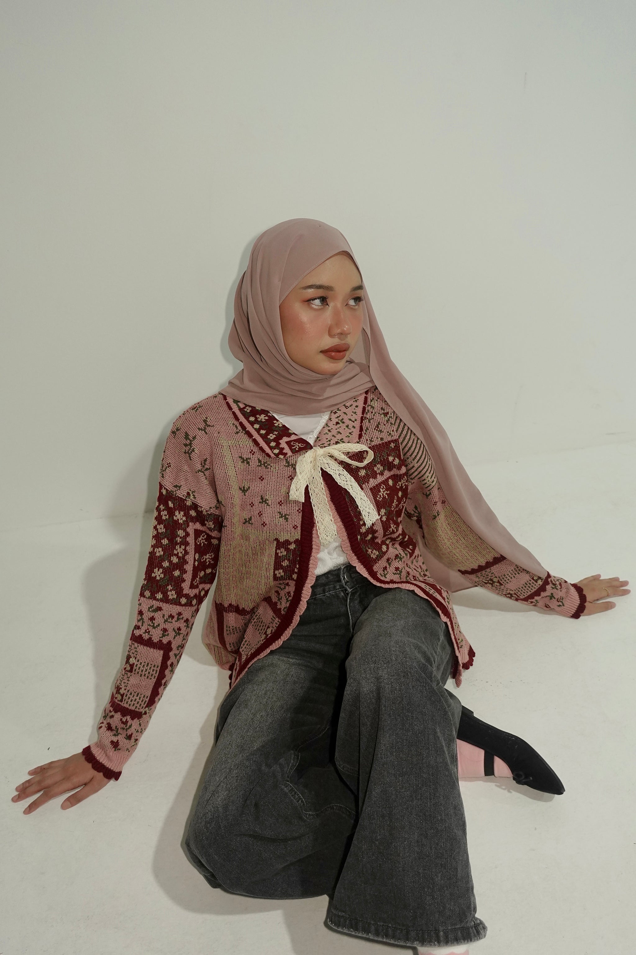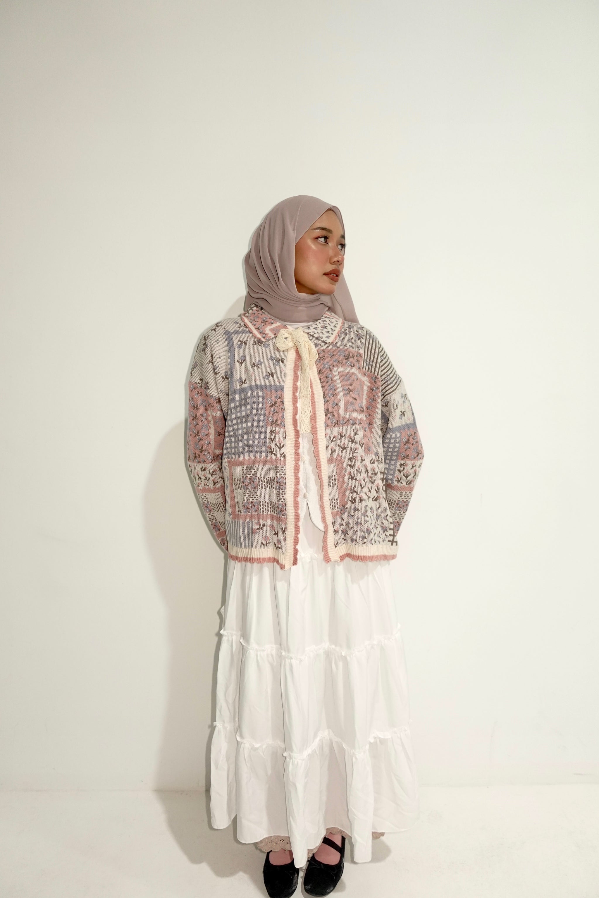 Featuring a whimsical patchwork design, subtle puff sleeves, and a classic open front, it's tied together with a delicate ribbon for a sweet, feminine finish.
